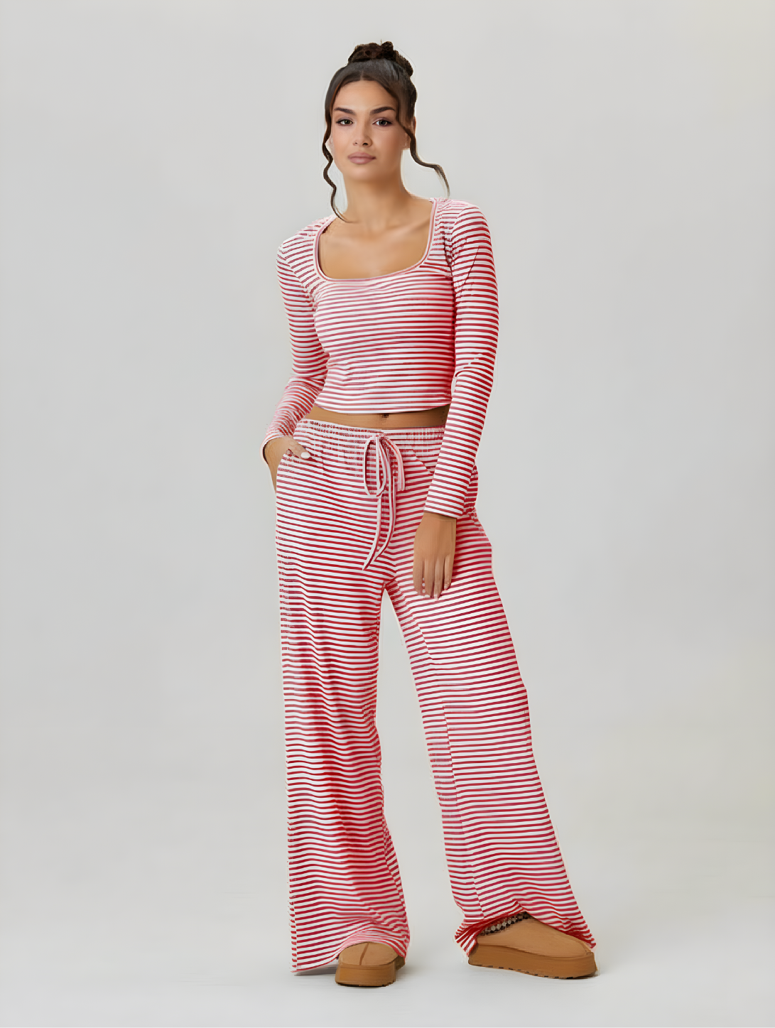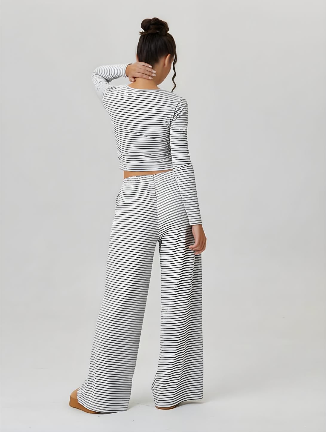 The set includes our signature long-sleeve striped top and matching wide-leg pants with an elastic waistband. Both pieces feature our proprietary CloudSoft™ fabric blend that stays buttery-soft through endless wears and washes.